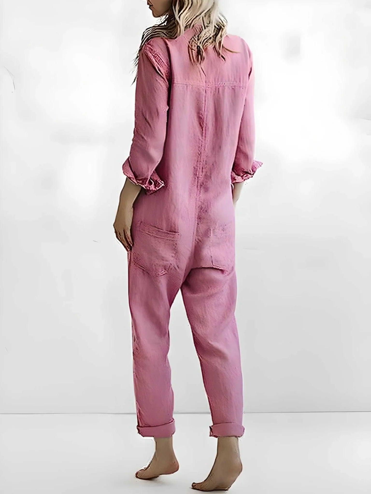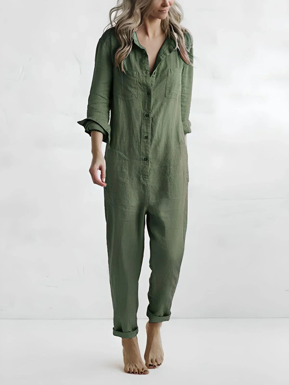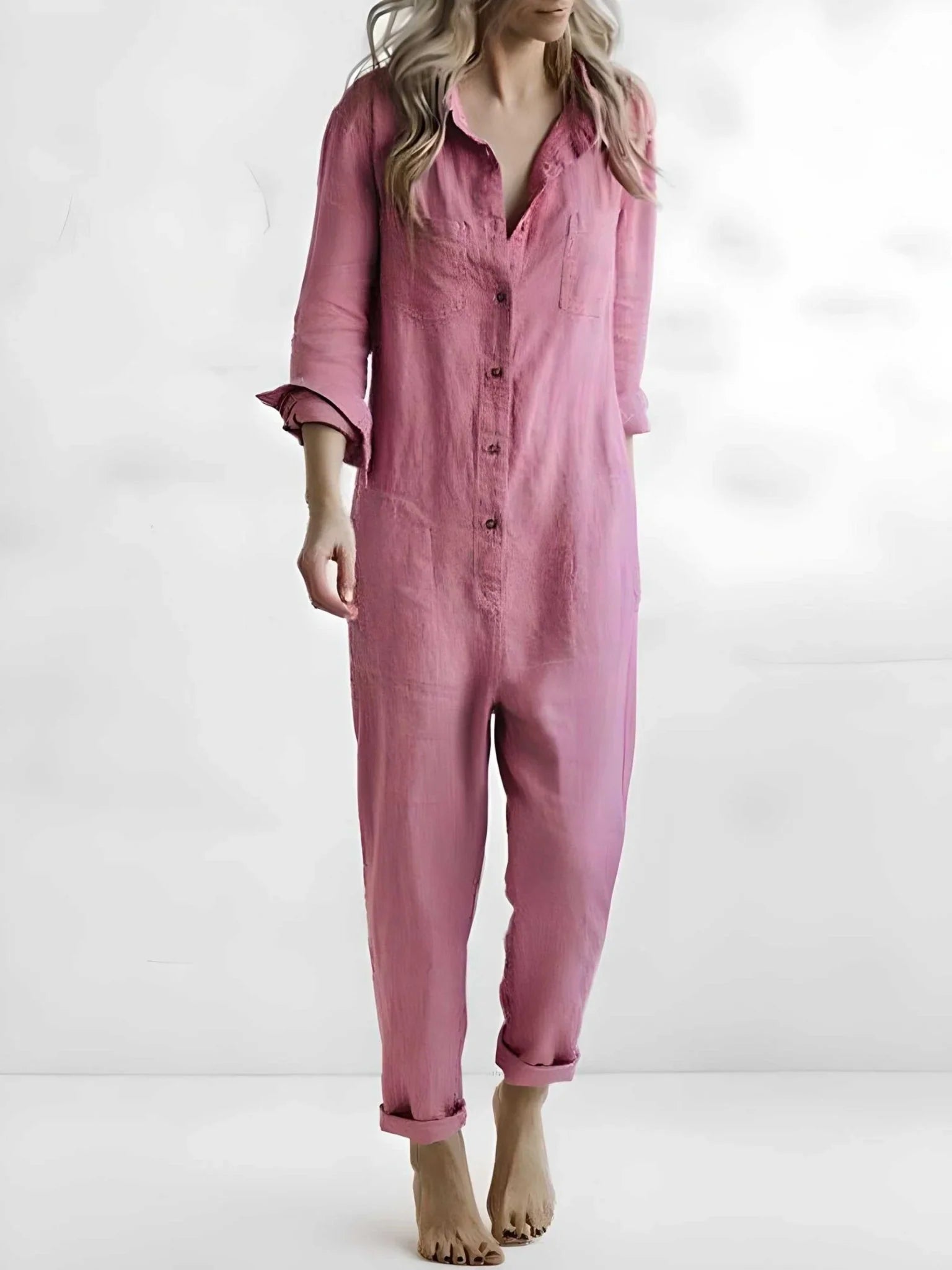 Made from a soft and breathable cotton-linen blend , this relaxed fit jumpsuit offers lightweight comfort and effortless style. Featuring a buttoned front, collared neckline and long sleeves that can be rolled up for versatility , this jumpsuit is perfect for casual days or lounging around.