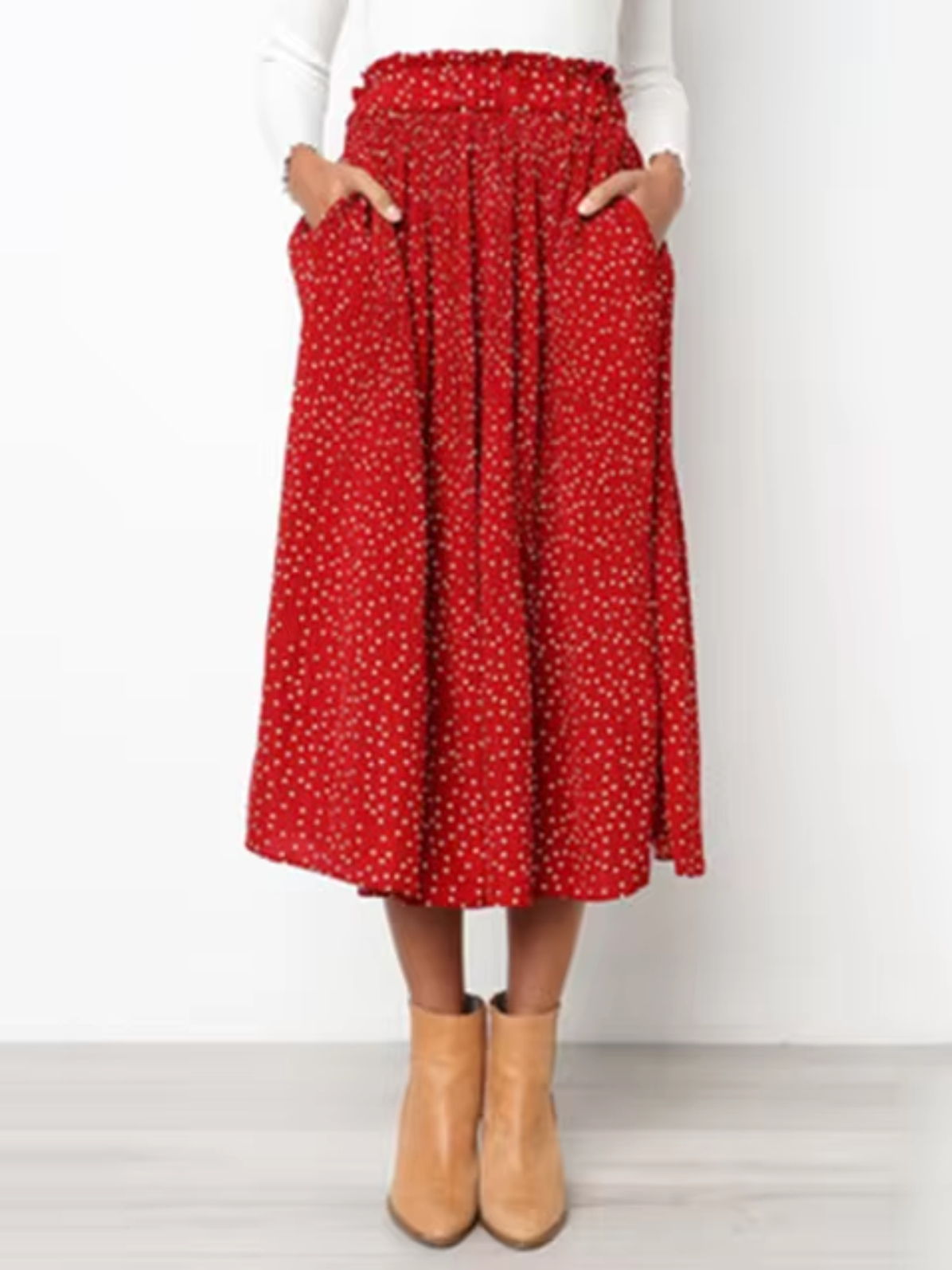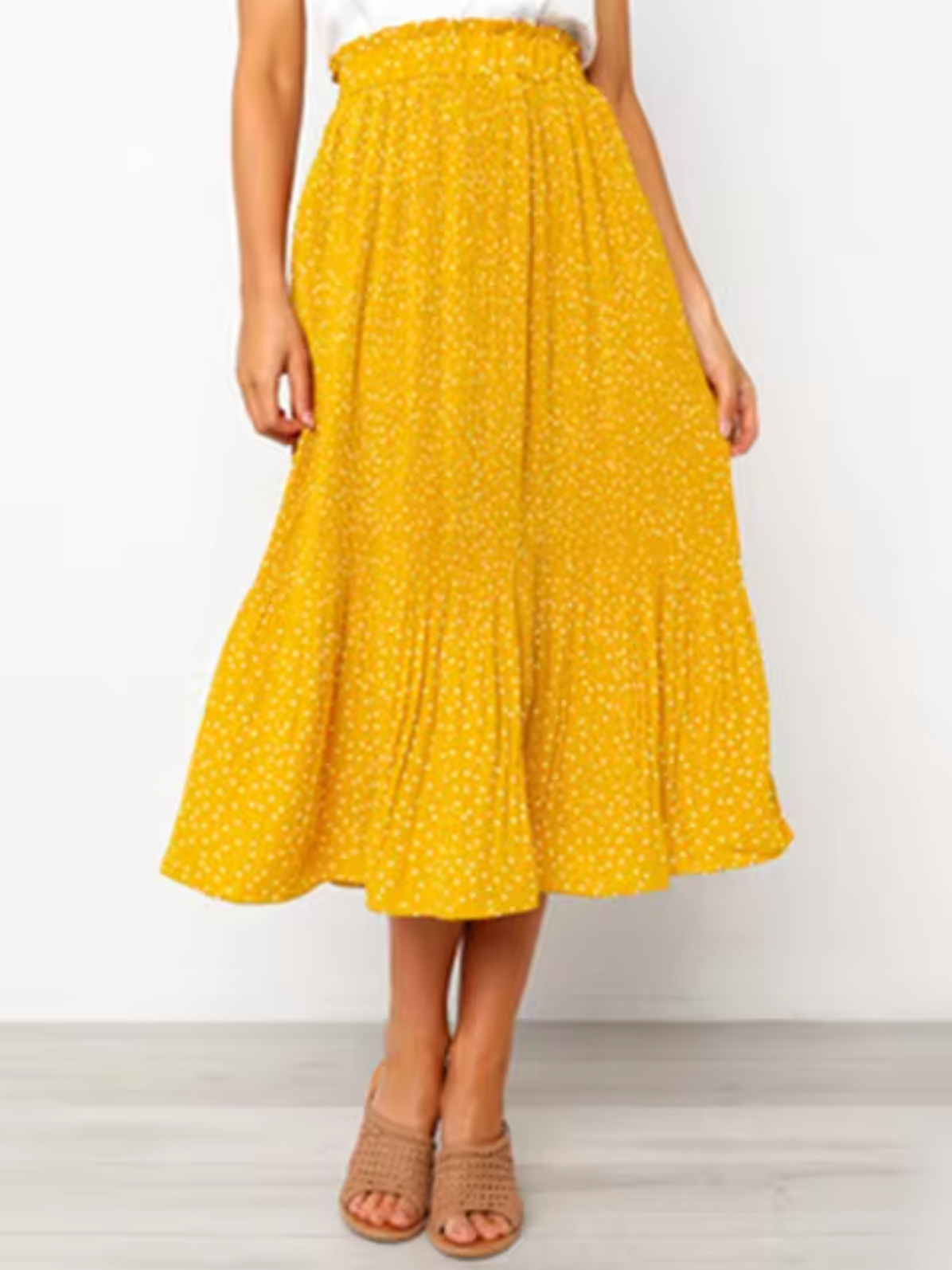 This elegant midi skirt is made from lightweight, breathable fabric with a charming polka dot floral print in white . The elasticated high waist ensures a comfortable and flexible fit , while the pleated design provides graceful movement and flow.