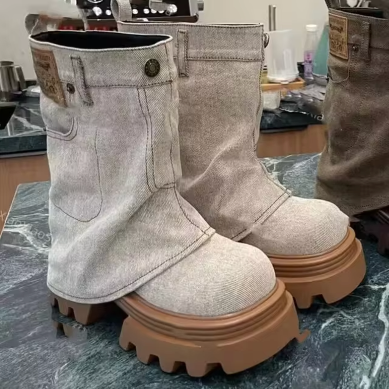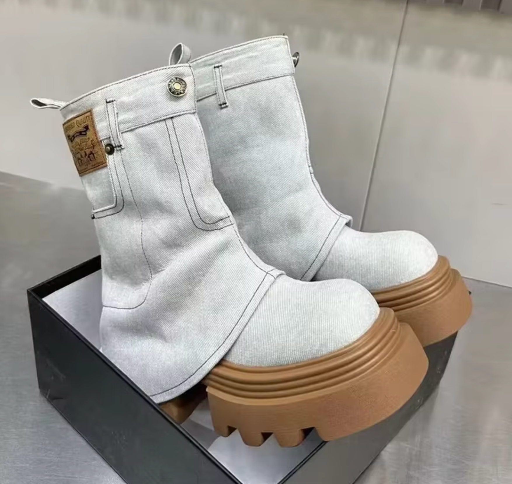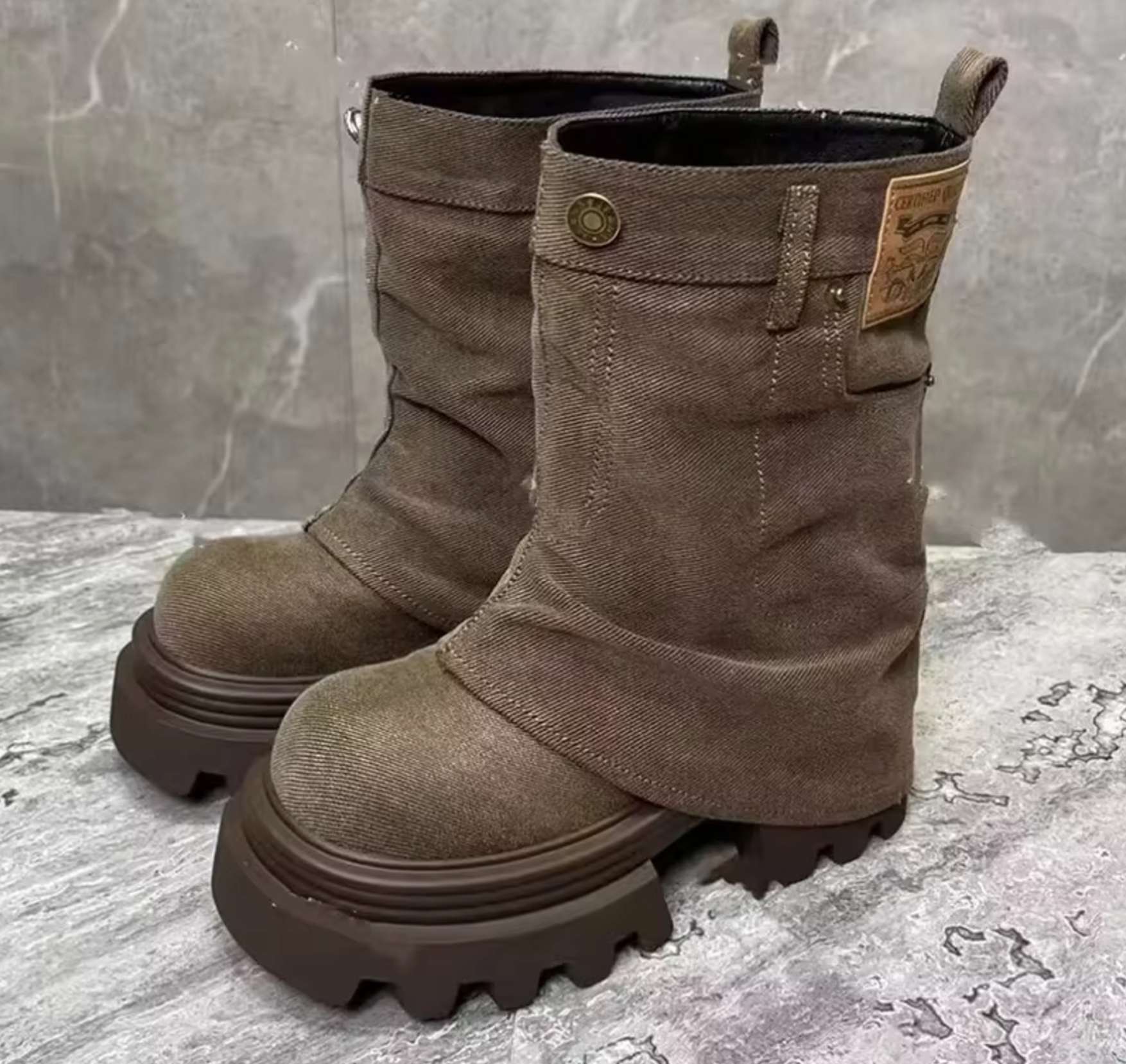 These edgy mid-calf boots redefine casual chic. Their unique denim upper mimics the look of jeans and features button and pocket details for added character. The chunky, textured platform sole offers excellent traction and a bold silhouette.