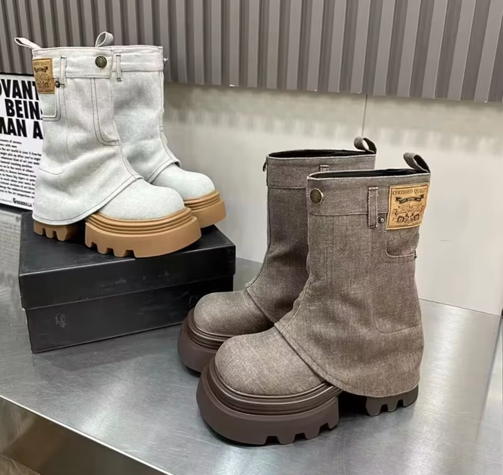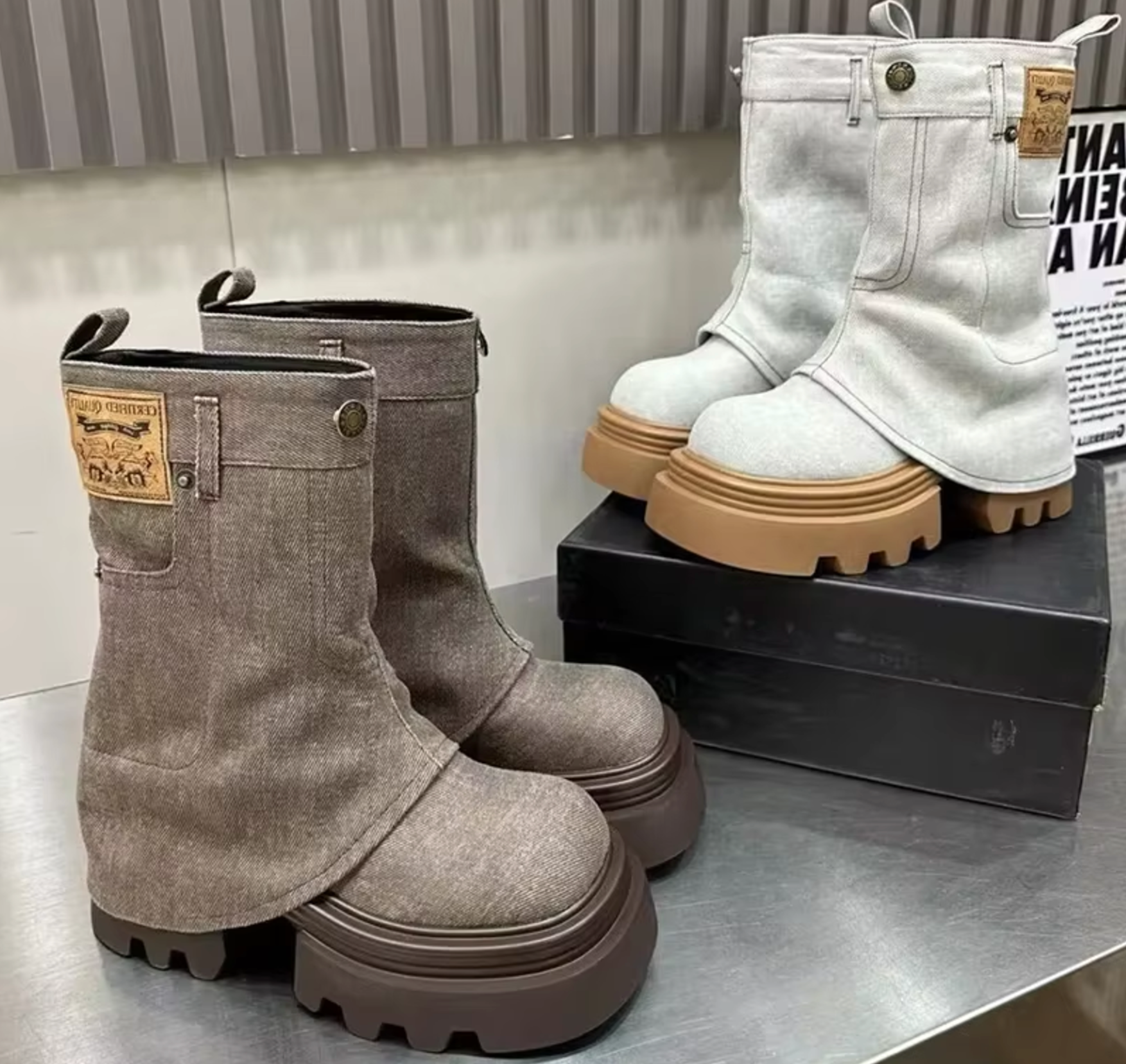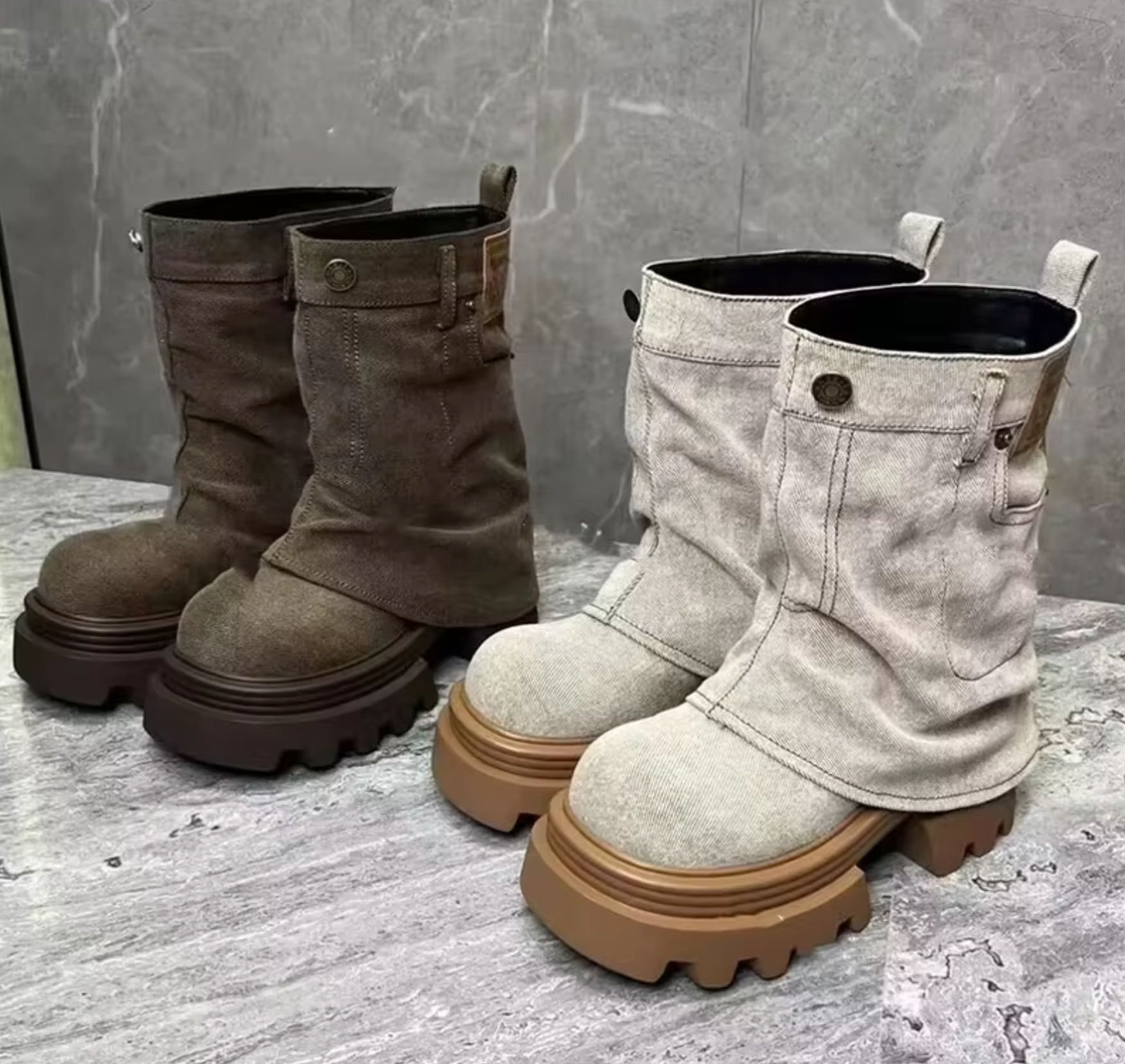 These edgy mid-calf boots redefine casual chic. Their unique denim upper mimics the look of jeans and features button and pocket details for added character. The chunky, textured platform sole offers excellent traction and a bold silhouette.