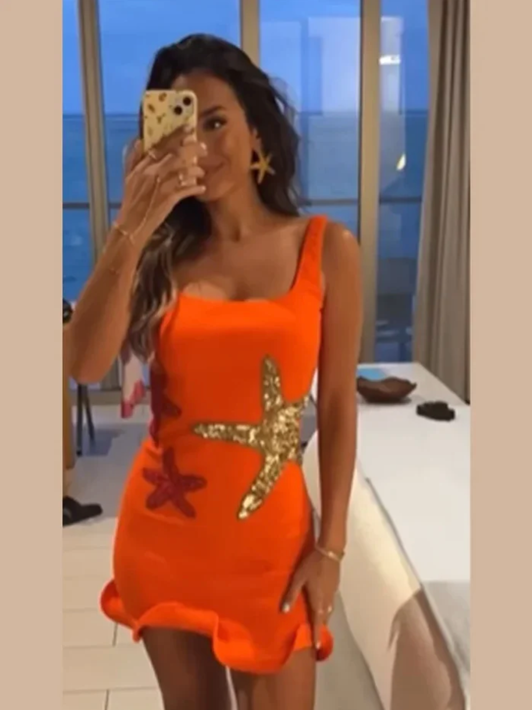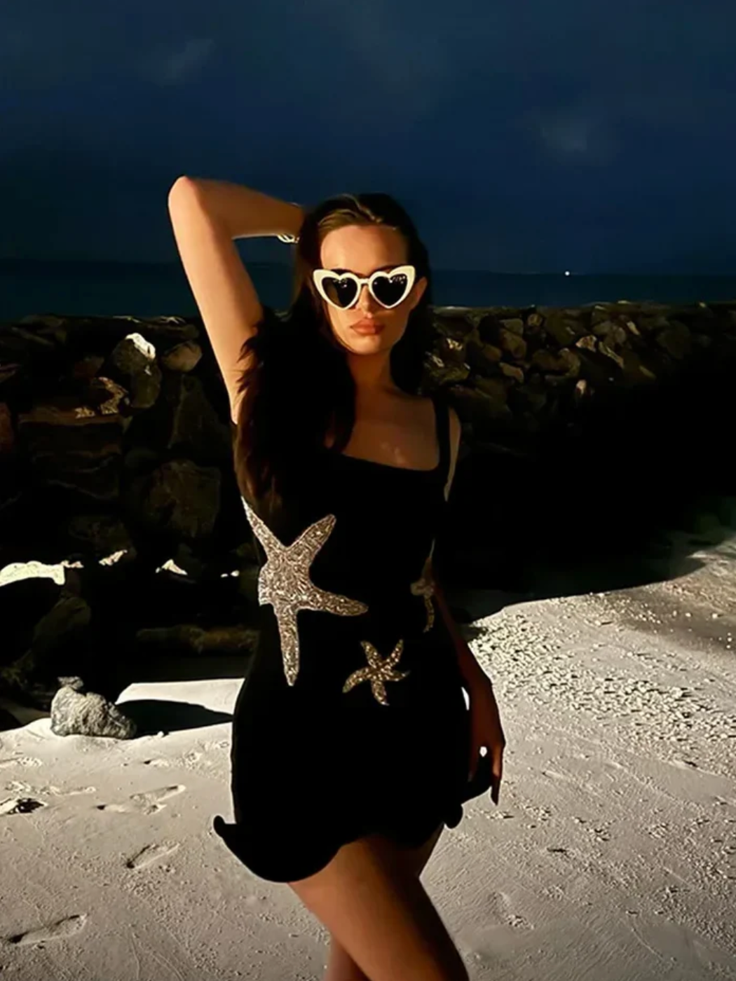 This striking mini dress is crafted from a smooth, stretchy fabric that hugs the body for a flattering, figure-hugging fit. It's embellished with shimmering sequin starfish appliqués , offering a daring, beach-inspired aesthetic perfect for vacation nights.
