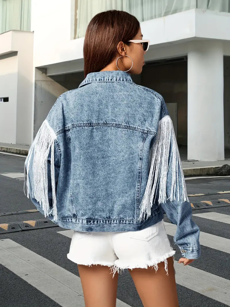 This eye-catching denim jacket features a bold design with long, shimmering fringe details on the front and sleeves , giving it a striking, western-inspired look.